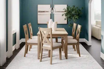 Show off your taste for charmingly curated style with the Sanbriar dining table set. Mastering modern farmhouse flair, the clean-lined design sports neutral seats punctuated by nailhead trim. A light, natural finish inspires delightfully carefree dining.