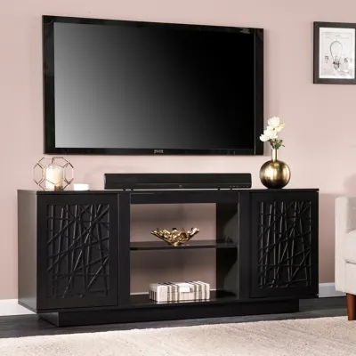 Create an entertainment oasis with this low-profile media stand. A spacious top displays decor pieces or framed photos, while textured, push-to-open doors tuck away DVDs and video games. Sleek black finish and stacked wood base craft a modern design, adding a contemporary feel to your space. Set the stage for video game sessions, movie marathons, or season finales when you add this modern media console to your living room or open concept space.