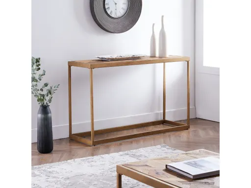 Unique style meets a sleek silhouette with this reclaimed wood console table. Sustainable wood inlay creates a patterned tabletop, crafting eye-catching visual appeal and functional display space. An open metal base provides airy, architectural design and highlights the patterned surface. Place this farmhouse inspired console underneath a wall-mounted TV to show off media and decor, or position in an entryway to set your style tone the moment you walk in the door.