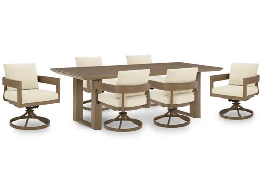 Elevate the appeal of easy-breezy living with the Serene Bay outdoor package. Made to look like wood yet durable enough to weather the elements, this furniture is sure to serve you and your besties well, year after year. The gently curved chairs feature cushions wrapped in Nuvella+™ high-performance fabric for plush refinement.