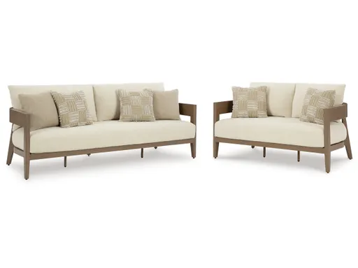 Elevate the appeal of easy-breezy living with the Serene Bay outdoor package. Made to look like wood yet durable enough to weather the elements, this furniture is sure to serve you and your besties well, year after year. The gently curved chairs feature cushions wrapped in Nuvella+™ high-performance fabric for plush refinement.