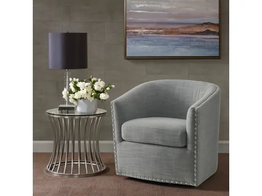 Relax in the comfort and elevate your living room with the Madison Park Tyler Swivel Chair. Upholstered in a rich gray fabric, this swivel chair features silver nail heads that line the arms and back for an elegant touch. The curved design creates a luxurious silhouette, while the high-density foam cushion provides a deep and comfortable seat. The swivel feature allows the lounge chair to rotate 360 degrees on its black metal base. No assembly required.