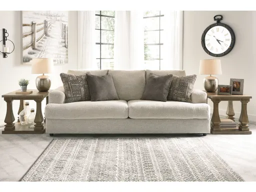 Flaunting a trendsetting silhouette, the Soletren sofa puts the contemporary in your contemporary home. Its “three over two” profile eliminates the center seat cushion, giving you elongated plushness and deep seating. And the chunky chenille fabric satisfies your need for a piece that feels as good as it looks. Soft jacquard chenille throw pillows add a splash of geometric pattern and color contrast.
