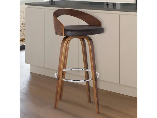 Add Mid-Century Modern design to your home with this Sonia Barstool. It is beautifully designed with a sturdy 360 degree footrest and carefully crafted in top-quality Walnut Wood finish, but also expertly upholstered with Brown faux leather upholstery and Walnut back. This piece provides both style and function with eye-catching contoured Wood back that can easily be integrated into your homes existing décor. While appearing stationary, the Sonia features a 360-degree swivel feature for maximum mobility. The plush padded seat with high density foam will provide you with all day comfort. The curved wood low back is ideal for posture alignment and an unmatched support for days on end. The foundation of the product is supported by wood and chrome footrest for a chic and stylish aesthetic without compromising practicality and functionality of this item. This product ships in one box with easy and quick set up. We stand by the quality, the craftsmanship and the integrity of our product by offer 1-year warranty for all our products. We want our customers enjoy our product and we will always be there to help with our top-notch customer service support. Available in 26" counter height and 30" bar height. Excellent choice for a contemporary dining setting.