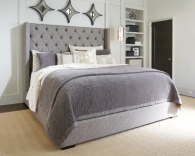 To create this masterpiece, we transformed the glamour of yesteryear into something fresh and new. Sorinella California king bed sets a high note for affordable luxury, with diamond tufting highlighting the upholstered wing headboard. Footboard and rails are also beautifully dressed in the rich gray fabric with warm brown undertones. Mattress and foundation/box spring sold separately.