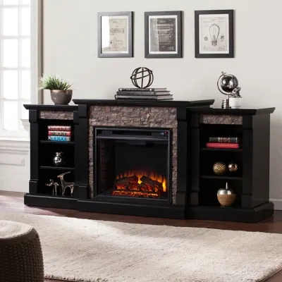 Set your heart aflame with this lodge inspired electric fireplace. Bookcase storage shelves media, novels or tchotchkes. Satin black melds with simulated black river stone for a rustic touch on this traditional fireplace silhouette. Low profile and wide scale, this electric fireplace with bookcases turns on chic style beneath your wall mounted TV in the living room or as a sleek buffet in the dining room. Energy efficient LED bulbs light the fire, a cost effective way to ignite bliss in any room without professional installation. User friendly remote control offers four-way adjustability to customize the fireplace from the comfort of your sofa. Flames and logs each have five-level adjustment, or off. An automatic shutoff and glass that remains cool to the touch ensure the fireplace warms safely. Turn off the heat to enjoy the fireplace ambience year round.