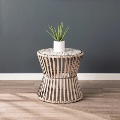 Round out your contemporary design with this outdoor accent table. A sturdy, all-weather frame completes your patio setup, while wicker straps string together a textured, natural look. A scattered ceramic petal pattern decorates the spacious tabletop, crafting a unique mosaic design and updating your poolside oasis. Add this ceramic-top end table on your deck to hold drinks and snacks or add alongside your outdoor sofa as a sophisticated plant stand.