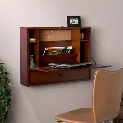 An ideal solution for any room, this wall mounted desk is neat and compact. Fold the desktop down to reveal a convenient storage area with shelves, bill organizers and a corkboard. The desk is finished out with a useful drawer to keep small things out of sight. Wherever you choose to use this, you are sure to be pleased with its amazing functionality.
