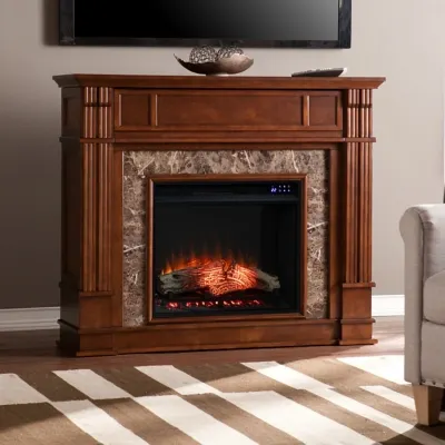 Cozy up to traditional style with this electric fireplace. Linear woodwork encapsulates crisscross hatching of lifelike granite veneer. Designed as an entertainment console, this electric fireplace fits beautifully beneath a wall mounted TV, while a recessed door shelf hides the mess of media equipment. Multicolor flames and lifelike embers create cozy ambiance year-round, with or without heat. Warm up your living space with this mission inspired piece—a must-have for any home.