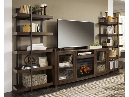 For fans of urban industrial design, the Starmore 3-piece entertainment center with infrared fireplace insert clearly steals the show. Its blend of acacia veneer and wood is beautified with an oiled walnut-tone finish for a highly contemporary aesthetic with grainy, earthy character. An infusion of dark bronze-tone metal takes the cool character to another level. While the look might be richly substantial, open-concept piers and glass-front cabinets lighten the mood. What really turns up the heat: an electric infrared fireplace insert with faux firebrick surround that operates with or without infrared heat. With the touch of a button, adjust the temperature and the flame brightness, and set the timer for long-lasting enjoyment.