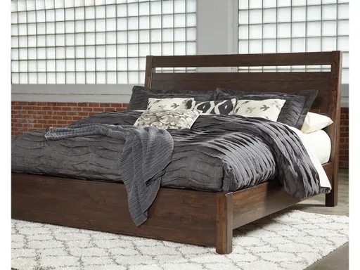For fans of urban industrial design, the Starmore king panel bed clearly steals the show. Its blend of acacia veneer and wood is beautified with an oiled walnut-tone finish for a highly contemporary aesthetic with natural, grainy character. Open plank detailing on the headboard and low-profile footboard perfect the look from head to toe. Mattress and foundation/box spring sold separately.