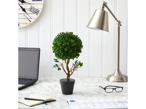 Add some natural greenery to both indoor and outdoor spaces with this artificial topiary tree; boasting a densely packed canopy of realistic-looking boxwood foliage designed with UV resistance to protect it from damage from the natural elements. Standing 15" tall from an accompanying nursery planter, this faux topiary tree eliminates any need for maintenance wherever displayed.