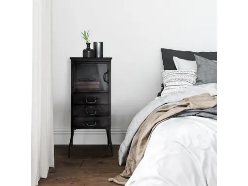 Add a vintage touch to any home or office with this Antique Black Metal Cabinet. It has an industrial black finish and a strong metal frame. Use it in the living room, bedroom or workspace. Store and organize items such as office suppliers, household accessories or everyday essentials. Each drawer can hold up to 11 pounds. The combination of metal and glass materials not only ensures longevity but also contributes to the cabinet's elegant and vintage look. With dimensions that are both practical and space-efficient, this cabinet is an ideal choice for those who appreciate both form and function in their furniture.