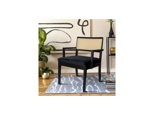 The Crawford collection is a symphony of modernity and nostalgia, crafted to inspire and captivate. With its unique blend of mid-century modern and contemporary design, this armchair is the perfect addition to any space. Featuring an 18.5-inch seat height, this armchair is taller than most accent chairs, making it a great choice for use as a dining chair or a non-traditional desk chair. The natural cane panel in the backrest adds a touch of bohemian flair, making this chair equally suited for modern boho and eclectic styles. Crafted from solid farm-grown FSC-certified eucalyptus wood, this armchair is as durable as it is stylish. The black velvet upholstery adds a touch of luxury, making this chair the perfect statement piece for any room. What sets this chair apart is its unique assembly technique that results in no visible bolts when fully assembled, giving it a clean and sleek look. Measuring 24 inches wide, 22 inches deep and 31 inches high, this armchair is the perfect size to fit in any room.