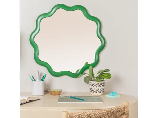 This Scalloped Wavy Wood Framed Wall Mirror is a unique piece that combines classic materials and artistic flair. The wood frame, featuring a playful wavy design, is painted in a classic green, making it a standout piece for any room. It fits seamlessly into decor themes ranging from the whimsy of cottage core to the eclectic charm of a boho space. With a diameter of 23.75 inches, it's sized just right for a variety of spaces. The mirror comes ready to hang with D-ring mechanisms that allow for easy installation, making it as practical as it is beautiful.