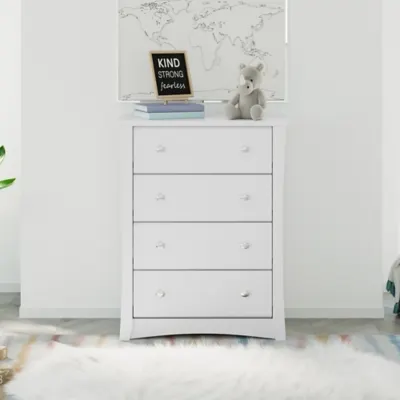 The Storkcraft Crescent 4-Drawer Chest is a universal nursery and bedroom storage solution featuring stylish metal knobs for added modern flare. Crafted with engineered wood, this chest features 4 spacious drawers, durable steel hardware, Euro-glide drawers with safety stops, and is fastened with German cam locks for dependable and reliable construction. Also, it's backed by Storkcraft's 1-year limited warranty and supportive customer care. The Crescent meets or exceeds all applicable federal safety standards, and complies with all applicable federal anti-tipping standards. Complete the Storkcraft Crescent Collection with the matching 3-Drawer Combo Dresser, 3-Drawer Chest, and 6-Drawer Double Dresser. Exclusively from Storkcraft, proud recipient of the 2023 Women's Choice Award for 9 out of 10 Customer Recommended Baby & kids furniture.