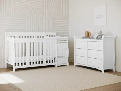 A Storkcraft classic, the Portofino 5-in-1 Convertible Crib and Changer combines unsurpassed quality with style in a versatile package. Offering plenty of storage with its three spacious drawers and three open shelves, this crib and changer converts into a toddler bed (Storkcraft Toddler Guardrail sold separately), daybed and full-size bed (Storkcraft Full-Size Crib Conversion Kit & Metal Bed Frame sold separately). Designed with safety in mind and constructed with quality pine wood and composites, the Storkcraft Portofino 5-in-1 Convertible Crib and Changer is available in multiple finishes. The Storkcraft Portofino 4-in-1 Convertible Crib and Changer is JPMA Certified and compliant with all applicable federal safety standards. Rest easy knowing that the Portofino is backed by Storkcraft's 1-year limited warranty and supportive customer care. Exclusively from Storkcraft, proud recipient of the 2023 Women's Choice Award for 9 out of 10 Customer Recommended Baby & kids furniture.