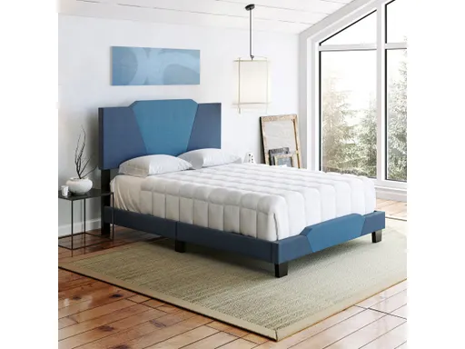 Bold block colors accentuate the unique diamond-shaped headboard and matching footboard of this upholstered bed frame. Bed is completely upholstered in linen and lightly padded for a premium look and feel. Base uses a quad cross-slat system and heavy-duty construction, that supports up to 700 lbs. A box spring or foundation is required with this base. Assembles in under 15 minutes. All hardware is included, conveniently zipped up in the back of the headboard. Entire bed ships in 1 box for easy transport. Limited 1 Year Warranty.