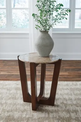 Not only does the stunning Tanidore end table enhance the aesthetic of your home, but it also provides practicality and functionality. Crafted with a mango wood frame and natural marble top, its solid construction and durable materials ensure years of reliable use. It's the perfect blend of contemporary style and timeless elegance.
