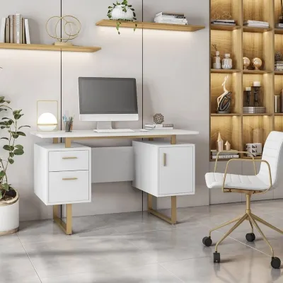 Aesthetically pleasing with clean lines, a large floating top, and gold metal track legs our white and gold computer desk with drawers and storage cabinet embodies the perfect combination of function, durability, and design in modern form. With its gold metal legs, this engineered wooden desk with drawers will add a touch of elegance to your office or as a bedroom desk with drawers. With its two drawers and storage cabinet, you will have ample space to keep your essentials organized and within reach. Whether you're working on a computer, tackling paperwork, or just need a desk with drawers for bedroom you'll have the space to spread out and work comfortably. No more feeling cramped or restricted as you bring your ideas to life. For added peace of mind it comes with a 5-year limited warranty. Shipped ready to assemble and easy to clean.