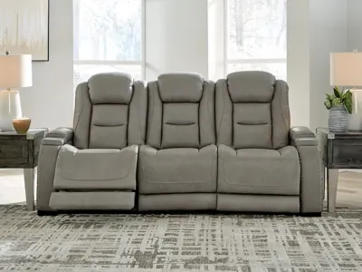 Reserved for him and made for her, the Man-Den power reclining sofa in gray delivers all the comfort and style you could ask for. Inspired by sports car interiors, the expertly matched leather and faux leather upholstery has a “perforated automotive” treatment for that much more appeal. Positioned at your fingertips, the advanced one-touch power control puts you in the driver’s seat with everything from an Easy View™ power headrest and power lumbar support, to a USB port and wireless charging for your phone. Talk about fully loaded. The middle seat reveals a pull-down table with dimmable reading lights and cup holders. And with integrated cup holders and hidden storage compartments under the posh, padded armrests, this designer power reclining sofa makes the most of every inch of space.