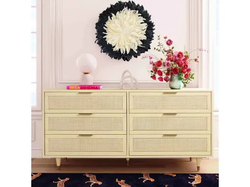 This six-drawer dresser takes the jungle-chic aesthetic to a whole new level. We love the minimalist silhouettes paired with cane and brass-tone details. Handmade by skilled craftsman, this piece provides ample storage space to hold your belongings with care.