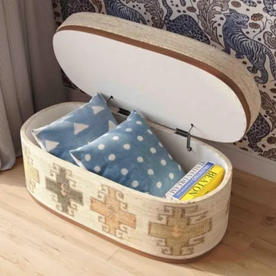 Add a textural touch to your living space with the versatile Olivier Oval Storage Ottoman, available in lush peach or ivory boucle or a captivating tribal cotton pattern. Featuring a tilting lid for convenient storage, this ottoman is wrapped in textured fabrics and accentuated with elegant acacia trim. The cotton option, adorned with a large tribal pattern in beautiful earthy tones, effortlessly enhances any space with its rich, bohemian flair, while the finished interior offers a refined touch.