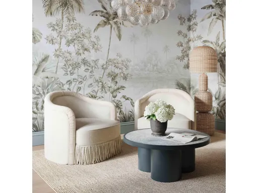 Introducing the Pamela Tassel Lounge Chair, a grandmillennial dream come true, available in luxurious cream boucle or serene faded blue recycled fabric. This sumptuous armchair boasts exquisite English ruched pleating, accented with high-end tassels that add the perfect decorative element to your space. Its incredibly comfortable design beckons you to unwind and relax, reassured by the fact that its soft, textured appearance is crafted from commercial-grade, environmentally-friendly fabrics made from upcycled plastic bottles.