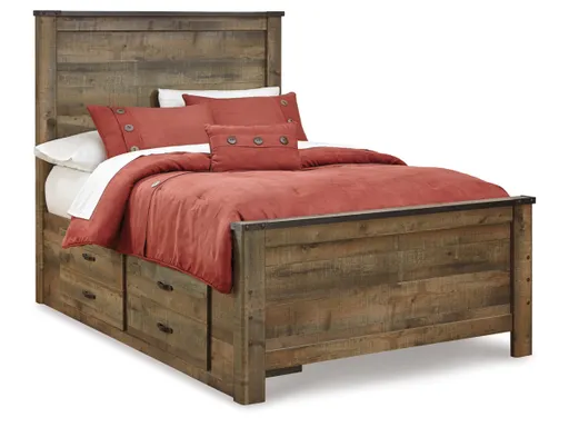 Whether she loves horses or he's a cowboy at heart, the Trinell full bed with under bed storage matches their authenticity. Its rustic finish, plank-style details and nailhead trim pay homage to reclaimed barn wood, making for a chic look loaded with charm. Mattress available, sold separately.