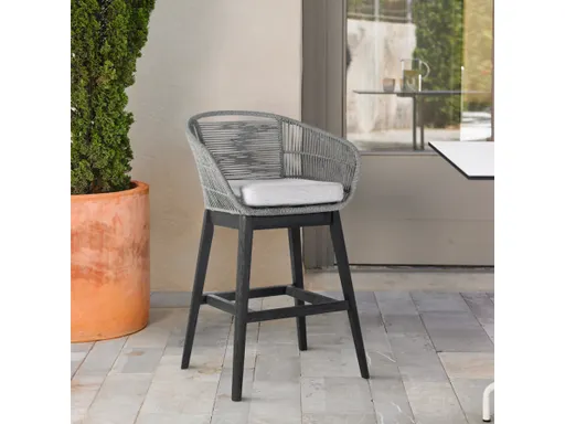 The Tutti Frutti Indoor/Outdoor Bar or Counter Height Bar Stool in Black Brushed Wood with Gray Rope from Armen Living is the quintessential choice of an outdoor bar stool that will give your indoor or outdoor living area a whole new aesthetic and presentation for you to enjoy. Featuring a eucalyptus wood base, the Tutti Frutti is durable and highly weather-resistant giving you years of extra enjoyment thanks to the longevity of these chairs. The incredibly comfortable beige seat cushion is meant to keep you relaxed and alleviate any discomfort. This chair is designed with a unique feature: the frame is wrapped with highly durable and immensely intricate woven rope, adding a completely new dimension to your outdoor furniture which will last just as long and will be even more eye-catching than conventional outdoor frame material. Pair with wood surfaces for an eclectic boho feel, or with concrete surfaces for a modern retreat. Its sturdy eucalyptus base is paired with an intricate marine-grade Regatta cord seat and topped with a soft cushion for a lesson in style and comfort. The rounded back gives ample support for lounging in your backyard, home bar, garden terrace, screened-in porch or poolside. The Tutti Frutti bar or counter height stool is available in your color choice of eucalyptus wood with a black brushed or aged teak finish and shades of gray rope with a beige cushion.