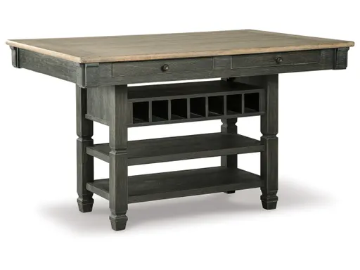 Invite your family into the heart of your home with the Tyler Creek rectangular counter height dining room table. A beautifully textured black finish and a timeworn planked oak top create a unique two-tone contrast. The base provides plenty of storage for wine bottles and other essentials, while drawers offer room for smaller items. This is trend-right urban farmhouse style.