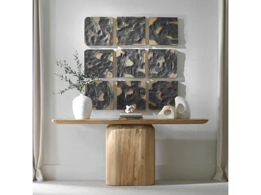 Displaying artisan crafted uniqueness to each piece, featuring hand torched suar wood in black and natural tones. Solid wood will continue to move with temperature and humidity changes, which can result in cracks and uneven surfaces, adding to its authenticity and character.