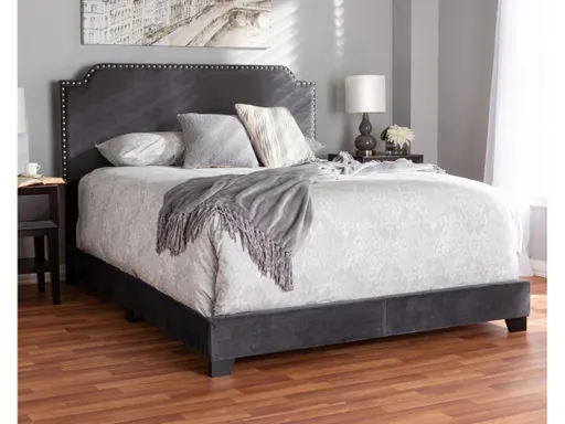 Create the high-glam bedroom of your dreams with this sumptuously upholstered bed. Gorgeous gray velvet fabric lends the upscale look and feel you’ve been longing for. Chrome-tone nailhead trim and notched detailing give the headboard just the right touch of tailoring.
