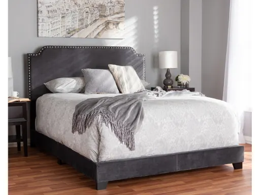 Create the high-glam bedroom of your dreams with this sumptuously upholstered bed. Gorgeous gray velvet fabric lends the upscale look and feel you’ve been longing for. Chrome-tone nailhead trim and notched detailing give the headboard just the right touch of tailoring.