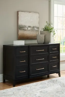 For those who love the classic profiles of traditional design—but want to forego the overly formal details—behold the Welltern dresser. Breakfront styling, saber legs and spacious storage drawers with framed fronts add distinctive touches. A rich black finish on the textured wood grain surface with rubbed-through edges offers a subtle sense of gently aged charm. What a beautiful take on urban revival design.