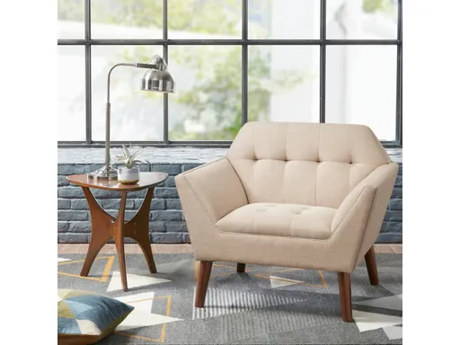 Accent your living area with the mid-century allure of INK+IVY’s Newport Lounge Chair. The tight back and seat offers extra plush comfortable seating and features a clean tailored look accented with button tufting details. Textured beige upholstery and a pecan finish on the tapered wood legs gives this lounge chair a warm contrast and alluring appeal. With its beautiful design and small silhouette, this mid-century lounge chair is sure to make a statement in your living room. Leg assembly is required.