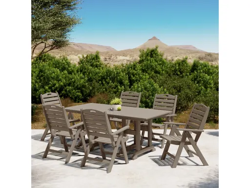 Bring a piece of that beachfront property home with this charming 7-piece patio dining set. Crafted from durable all-weather HDPE material, it is fade and UV-resistant, making it the ideal choice for outdoor use. Enjoy warm, sunny days without the sun getting in the way, thanks to the table's built-in 1.9" diameter umbrella hole, which is perfect for adding an existing umbrella. Lay back after an amazing meal with the reclinable backrest, which has four positions, adding overall comfort. Once mealtime is over, pick up the chair and fold it for easy storage, making cleanup a breeze. The table is designed to be sturdy and durable with the trestle design that evenly distributes weight and add extra stability to reduce wobbling.