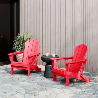 Lend a fun pop of color and style to your outdoor area with this charming Adirondack chair set. Durable recycled poly material resists splits, cracks, rot, and peeling for a lasting and attractive element you are sure to appreciate. Slatted detailing on the seats and arched backs and waterfall fronts make for more comfortable seating for you and guests to enjoy.