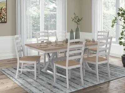 Busy breakfasts and family dinners get a dose of modern farmhouse flair with the Westlinport dining package. Its two-tone finish contrasts a light butcher block hue with antiqued white for an utterly charming effect. An effortless dining solution, this set adds a touch of chic character to your space.