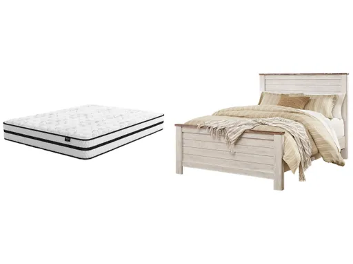 The ultimate look for a beach cottage or shabby chic-inspired retreat, the Willowton panel bed carries you away to a dreamy time and place. Its driftwoody whitewash finish is wonderfully easy on the eyes. Plank-style detailing incorporates a classically rustic touch that's so homey and comforting. The addition of a hybrid innerspring mattress allows you to enjoy endless possibilities for restful sleep. Plus, this mattress arrives ready for quick and easy setup. Simply bring it to your room, remove the plastic wrap, and unroll.