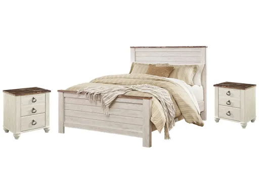 The ultimate look for a beach cottage or shabby chic inspired retreat, the Willowton 5-piece bedroom set carries you away to a dreamy time and place. The queen panel bed's driftwoody whitewash finish is wonderfully easy on the eyes. Plank-style detailing incorporates a classically rustic touch that's so homey and comforting. Nightstands with antiqued brass-tone hardware are beautifully functional. Mattress and foundation/box spring available, sold separately.