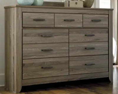 Urban sophistication with a decidedly relaxed air. If effortless elegance is the impression you’re going for, the Zelen dresser is custom made to fit your space. It’s got the crisp, clean lines of a contemporary piece, but with softly weathered elements, including antiqued industrial pulls and an earthy finish that lets the beauty of replicated oak grain flow through. Seven smooth-gliding drawers of varied size make it a bedroom essential.