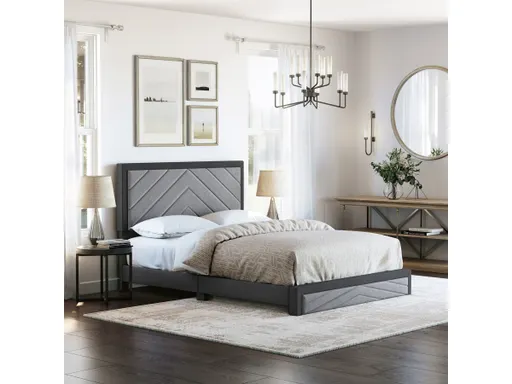 A chevron-themed headboard and footboard shows off the architectural stitching of this upholstered platform bed. The footboard extends to the floor for a unique, modern appeal. The bed comes with a 14-slat support system that holds up to 700 lbs. A box spring is optional with this bed. This platform bed ships in a single box, with easy-to-follow instructions to go from box to bed in under 30 minutes. Comes with a limited 1 year warranty.