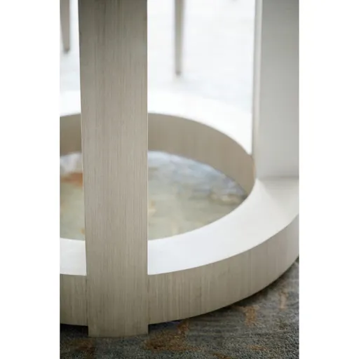 With a clean, modern form and combination of finishes, the Axiom round dining table offers glamorous transitional style and unique visual appeal. In this sleek, geometric design, a round glass top with an eased edge rests on an open circular base with four leg posts. On the base, engineered faux anigre veneers are presented in two silky, low-sheen finishes that work together to create texture and depth. The result of fine craftsmanship, this piece delivers contemporary elegance with a warm and inviting feel.