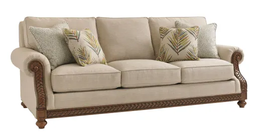 Create an island oasis in your living room or family room with this exceptional sofa. Design features include rolled arms with elegantly curled fern wood accents, traditional turned legs and wooden base rail. This graceful sofa will create a casual appeal with tropical accents for your décor. Two 20 x 20 inch and two 18 x 18 inch blend down throw pillows provide visual contrast and comfort. Settle into the ultra down seat cushions after a long day working or playing in the sun and relax in luxurious style!
