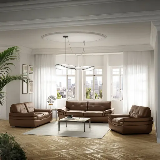 This contemporary 3-piece living room set is designed to provide comfort and style to your home. The set features a sleek and smooth leather stitching, crafted with skilled Italian artisanship, giving it a sophisticated look. The upholstery frame construction is a combination of solid woods with plywood, OSB, particle board, a Masonite wrap, and a foam covering for protection, making it easily adaptable to various design styles.