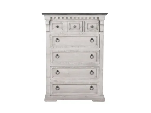 This chest exudes a sense of antique opulence with its distressed white finish and intricate detailing. With five drawers, it offers ample storage space, and its top drawers are felt-lined and feature Zamak pulls. The drawers are crafted with English dovetails and full-extension side mount metal glides, providing both a classic touch and modern functionality. The iron gray top serves as the perfect finishing touch, adding a dramatic element to this stunning piece of furniture.