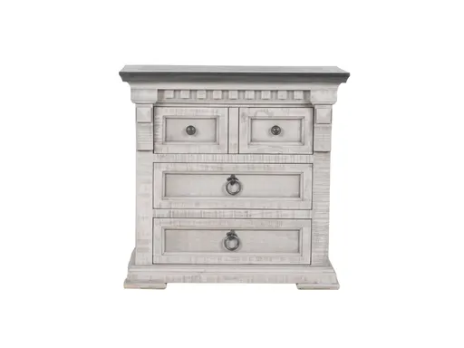 This nightstand exudes a vintage charm with its distressed white finish and intricate detailing. Its top drawers are lined with felt, and the piece features Zamak pulls and English dovetails with full extension side mount metal glides that blend antique style with modern functionality. The iron gray top adds a final touch of drama to this beautiful nightstand, making it an excellent addition to any bedroom.