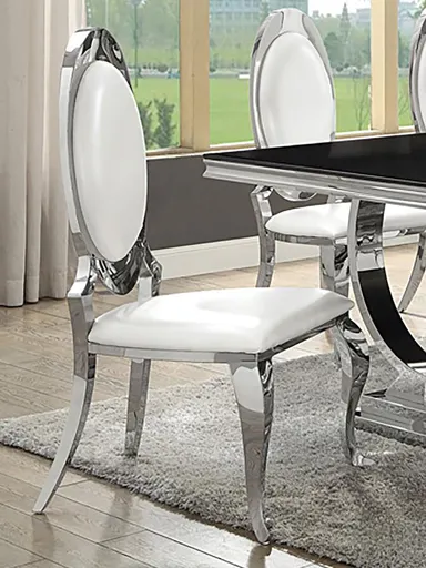 This dining chair blends classic form with modern materials for a bold statement. An oval backrest and gently flared silhouette evoke traditional influence, while the stainless steel frame and Queen Anne cabriole legs add a sculptural presence. Upholstered in smooth white faux leather, the cushioned seat and back provide comfort with easy care. The polished chrome finish completes the look with reflective shine and visual contrast.Anchorage - Back, Box 1 of 2 - Cream