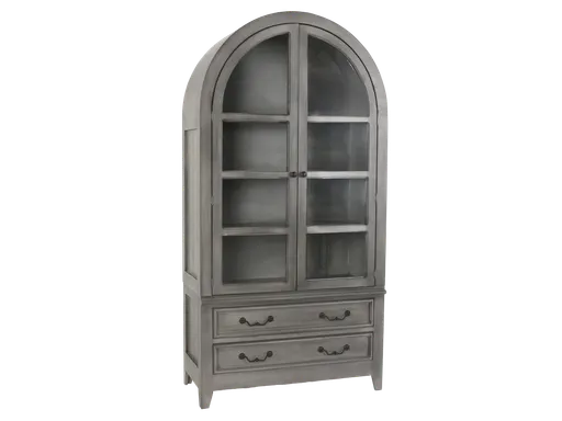 Showcase your collectibles in style with this elegant arched gray display cabinet. Featuring four spacious shelves behind framed glass doors, it offers the perfect view for your treasured items while keeping them dust-free. Two lower storage drawers provide additional space for linens, dinnerware, or everyday essentials. Crafted with a sophisticated arched top and a smooth gray finish, this cabinet blends timeless design with practical functionality—ideal for dining rooms, living areas, or home offices.